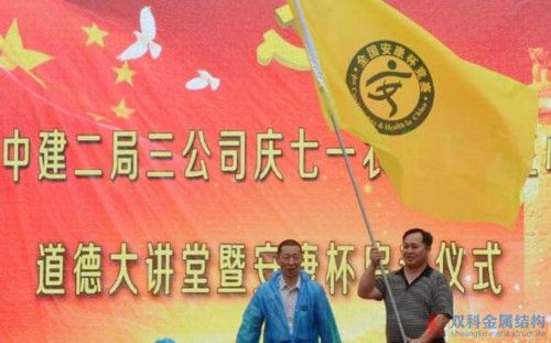 活動(dòng)過(guò)程中,中建二局三公司十堰萬(wàn)達(dá)項(xiàng)目部工地開展了慶“七一”農(nóng)民工“三心”(自信心、責(zé)任心、進(jìn)取心)道德教育,同時(shí)啟動(dòng)了2015年“安康杯”活動(dòng)。十堰市總工會(huì)對(duì)中建二局進(jìn)行了授旗。